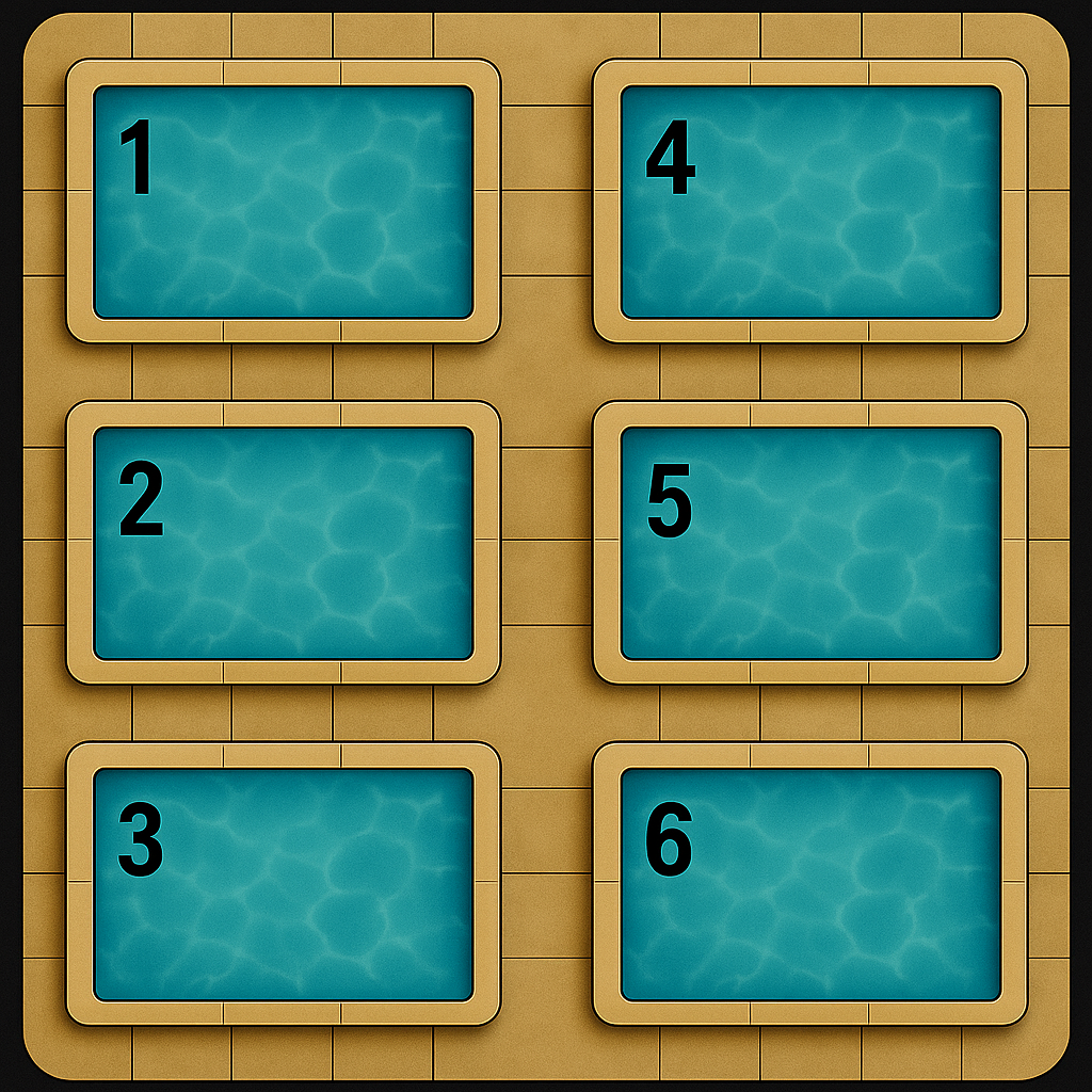 The game features more pools than guards (e.g., 4 pools, 3 guards). Lifeguards must strategically choose which pools to guard each night, while Patrons attempt to sabotage unguarded pools.